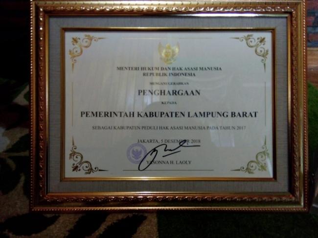 Lampung Barat Terima Penghargaan Kabupaten Peduli HAM
